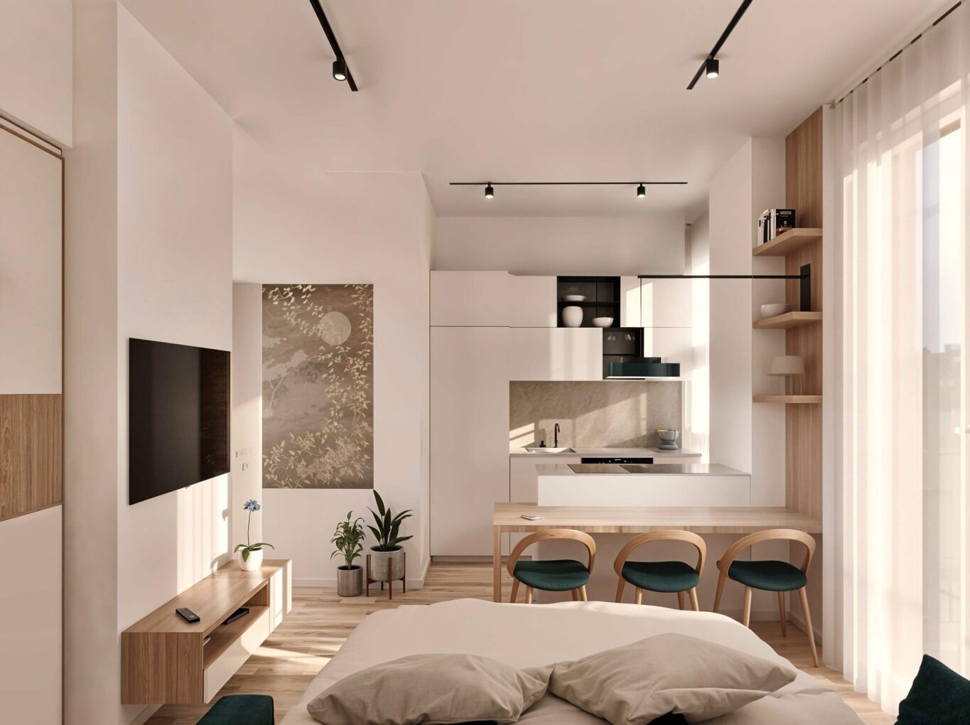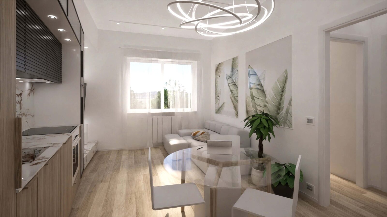 Il progetto prevede un ingresso valorizzato da eleganti abbassamenti estetici con illuminazione a led e prosegue in un’accogliente zona living con angolo cottura. È presente un comodo ripostiglio con attacco per la lavatrice. Il bagno, finestrato, è dotato di una moderna doccia in resina e rifinito con materiali di qualità.