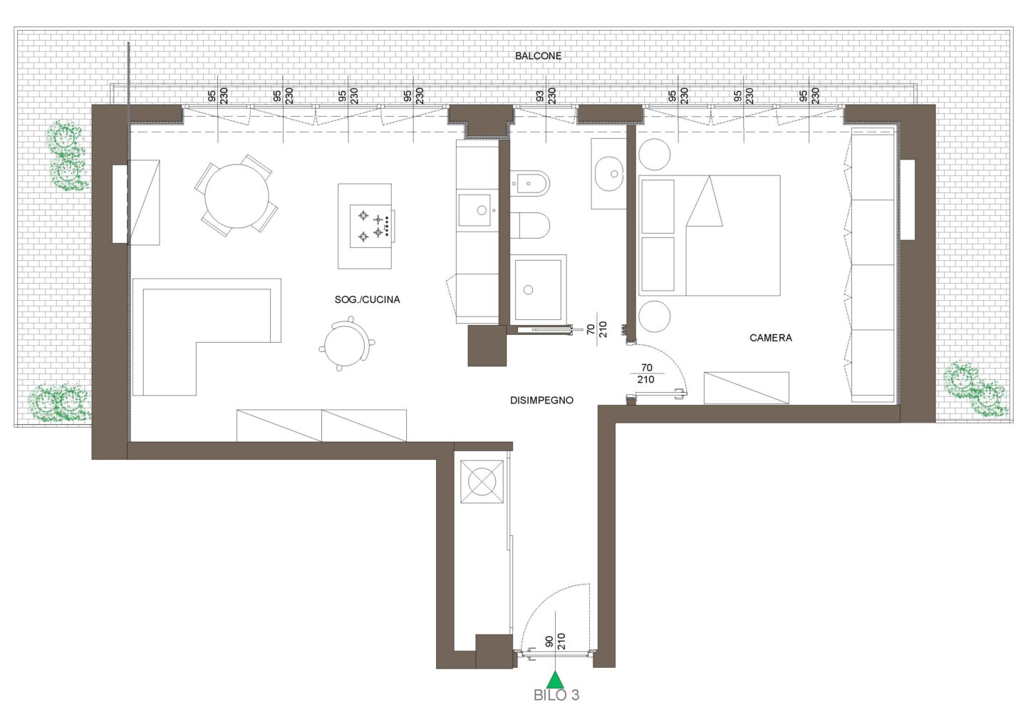 L’appartamento sarà composto da ingresso con abbassamenti estetici dotato di luci a led, corridoio con ripostiglio dotato di attacco per lavatrice/asciugatrice, soggiorno avente cucina con isola, ampia camera matrimoniale e bagno finestrato con doccia, sanitari filo muro e finiture di qualità. Tutti gli ambienti affacciano su un grande balcone.