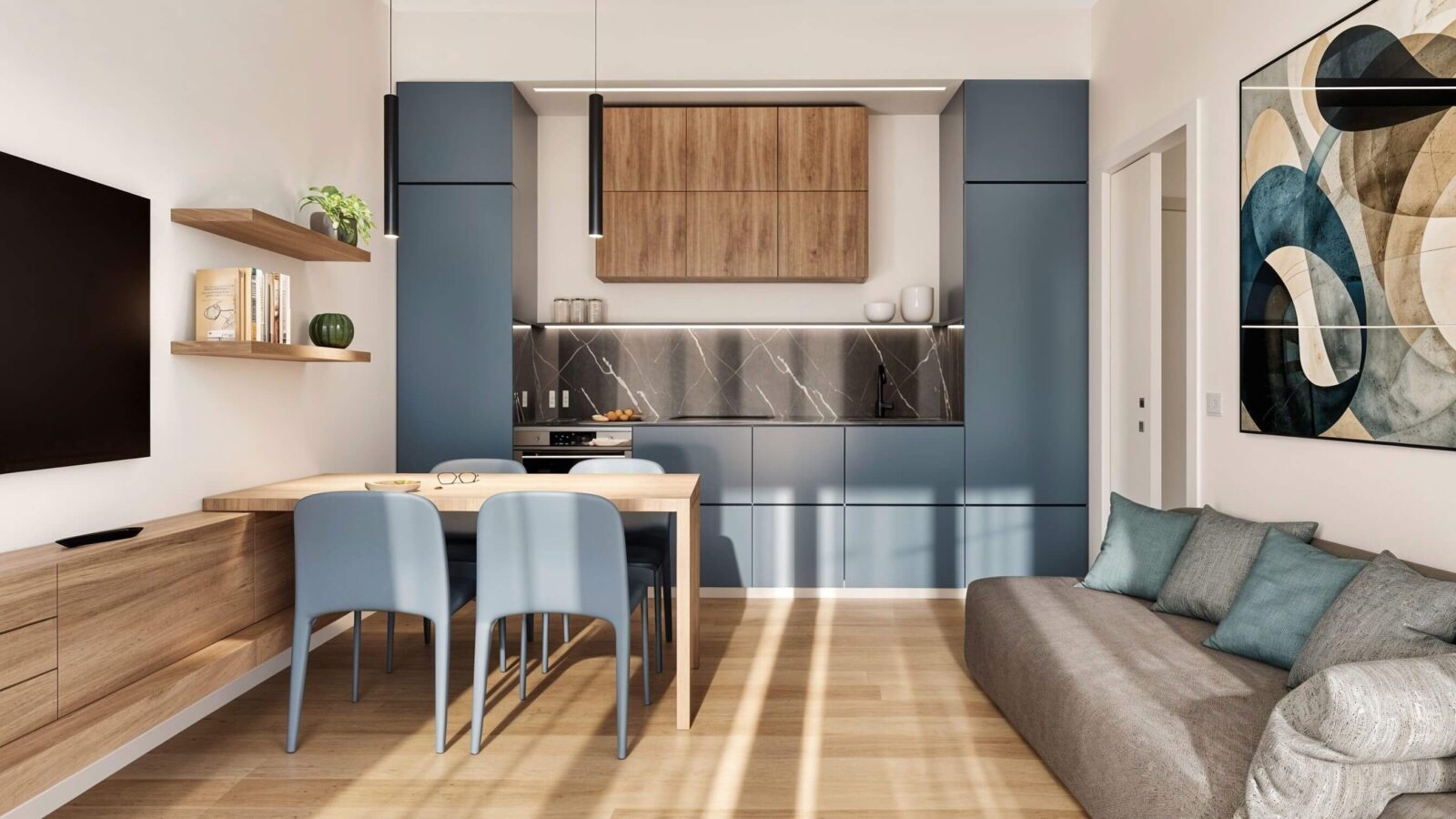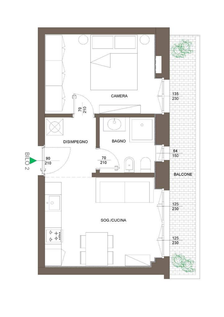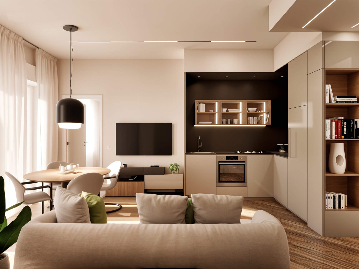 L’appartamento sarà composto da ingresso con abbassamenti estetitici dotato di luci a led, disimpegno, soggiorno con angolo cottura, ampia camera matrimoniale e bagno finestrato con doccia e sanitari filomuro.