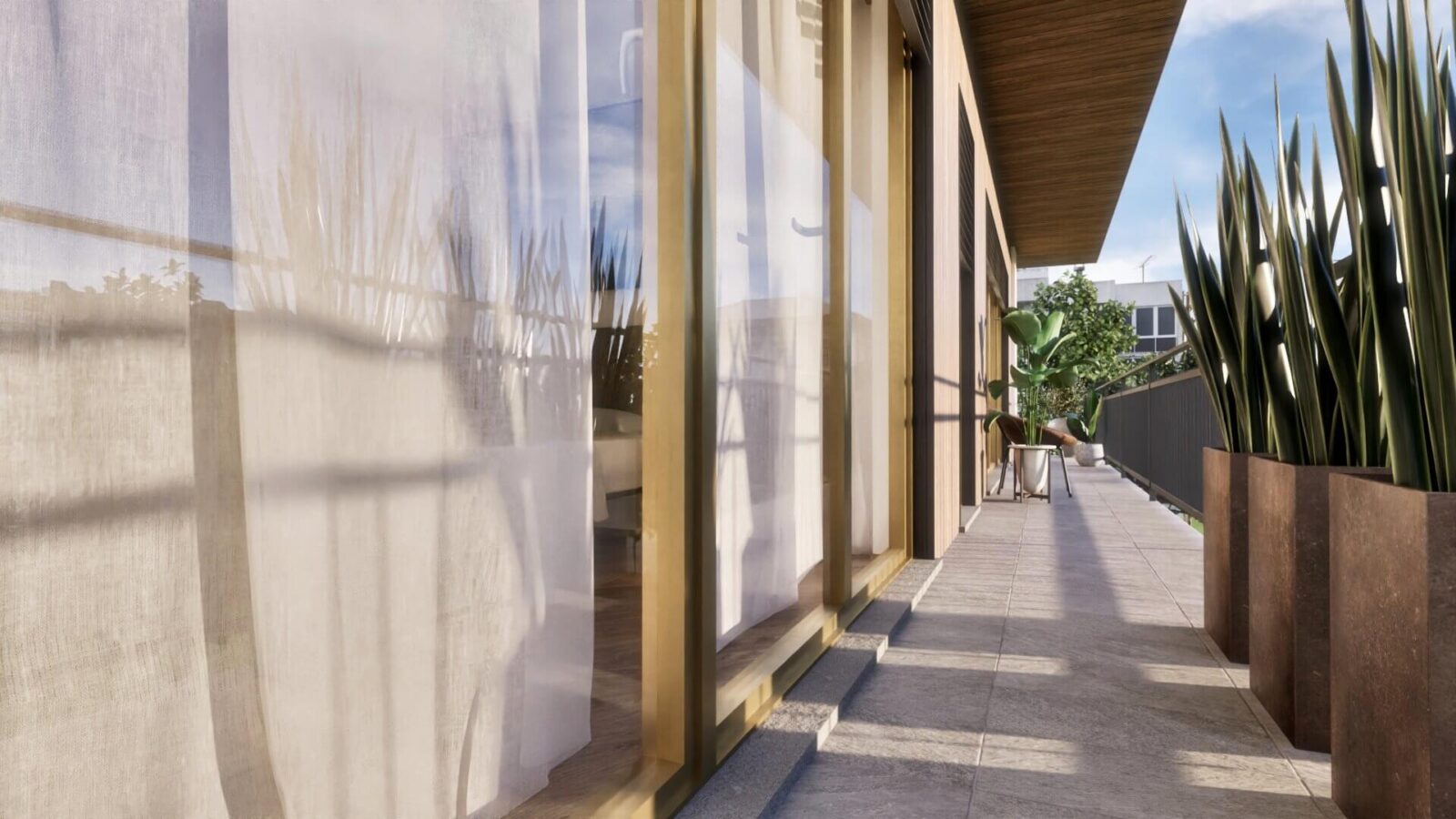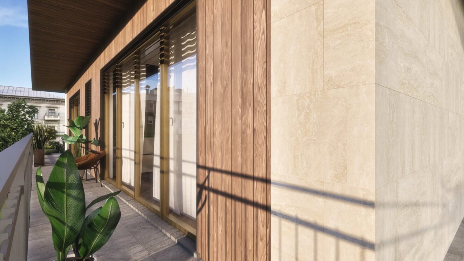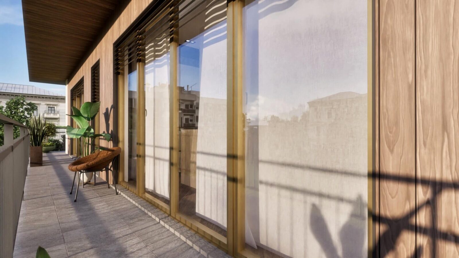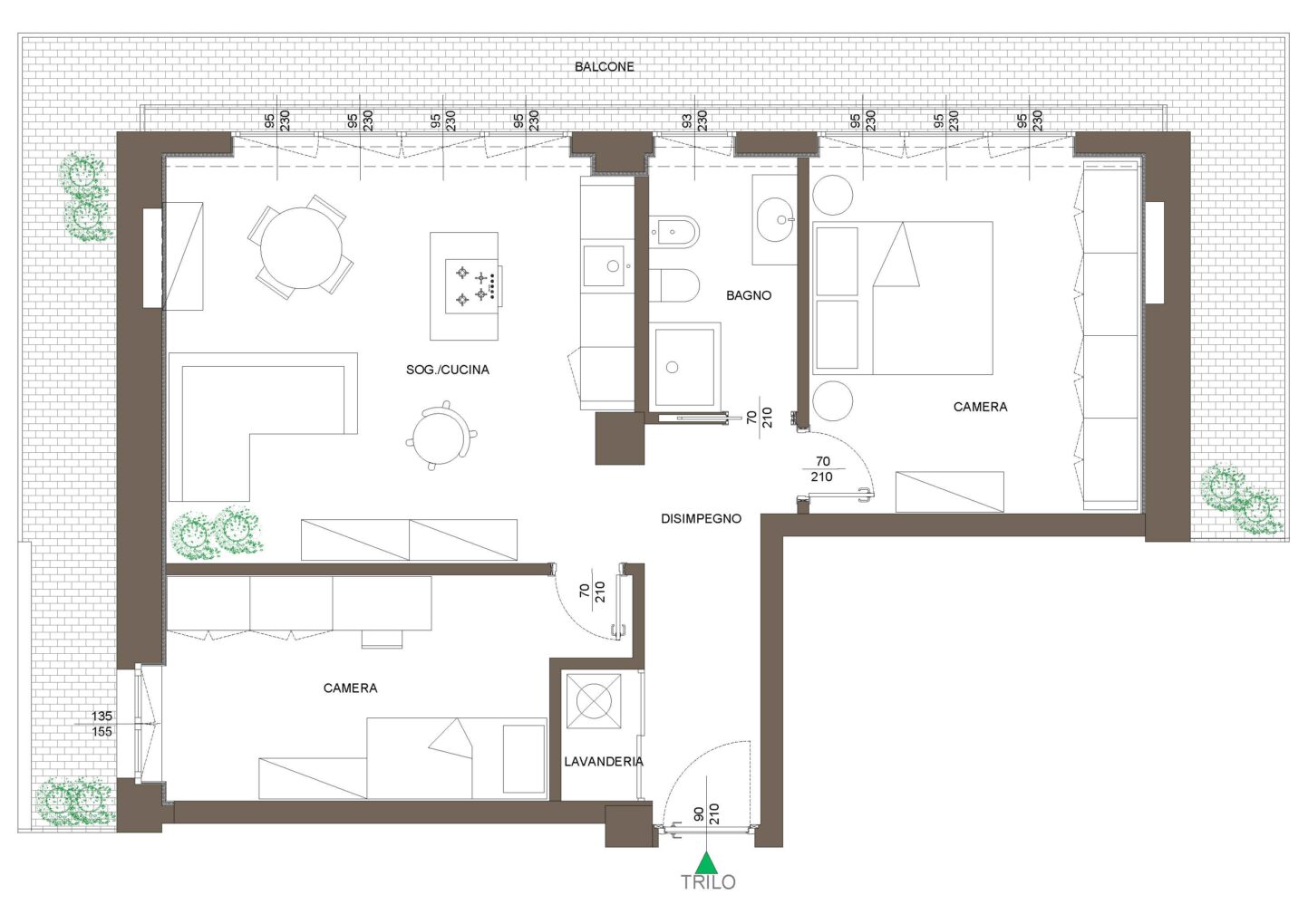 Tutti gli ambienti si affacciano su un grande balcone che circonda l’intera superficie dell’appartamento.