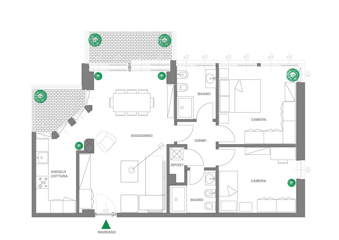 L’appartamento sarà dotato di ampia zona living con angolo cottura separato, due camere da letto, disimpegno, doppi servizi, comodo ripostiglio con attacco per la lavatrice e due balconi.